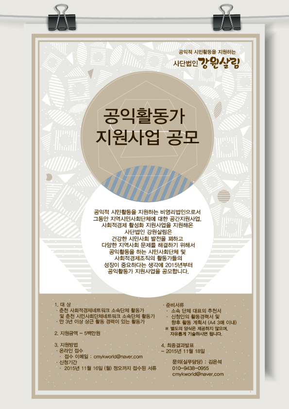 | 2015 공익활동가지원사업(춘천) 공모 선정결과 (0) | 2019.09.19 |
