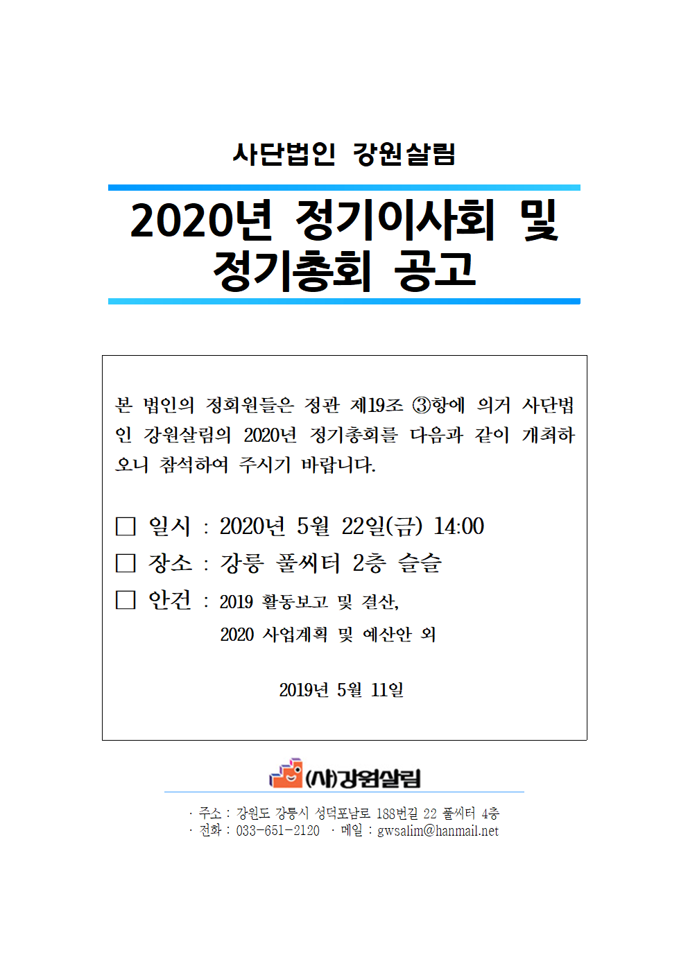 본 법인의 정회원들은 정관 제19조 ③항에 의거 사단법인 강원살림의 2020년 정기총회를 다음과 같이 개최하오니 참석하여 주시기 바랍니다.