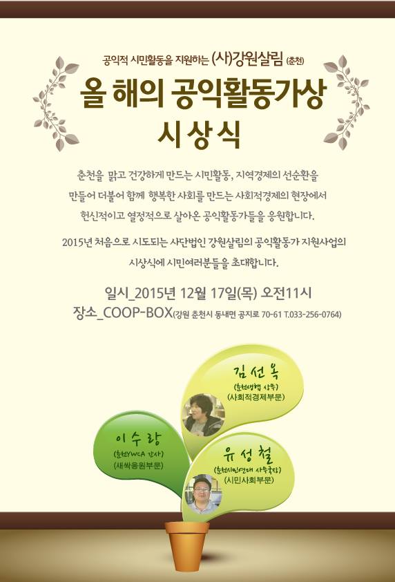 2015년 처음으로 시도되는 사단법인 강원살림의 공익활동가 지원사업의 시상식에 시민여러분들을 초대합니다. 춘천을 맑고 건강하게 만드는 시민활동, 지역경제의 선순환을 만들어 더불어 함께 행복한 사회를 만드는 사회적경제의 현장에서 헌신적이고 열정적으로 살아온 공익활동가들을 응원합니다.