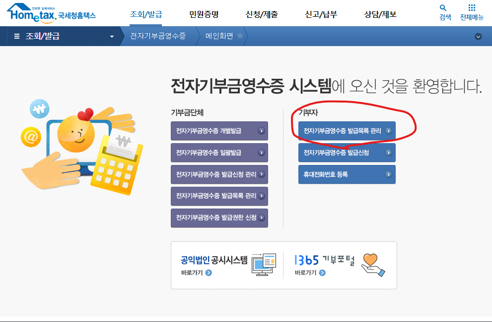 조회/발급 메뉴의 전자기부금영수증 - 메인화면을 클릭합니다.