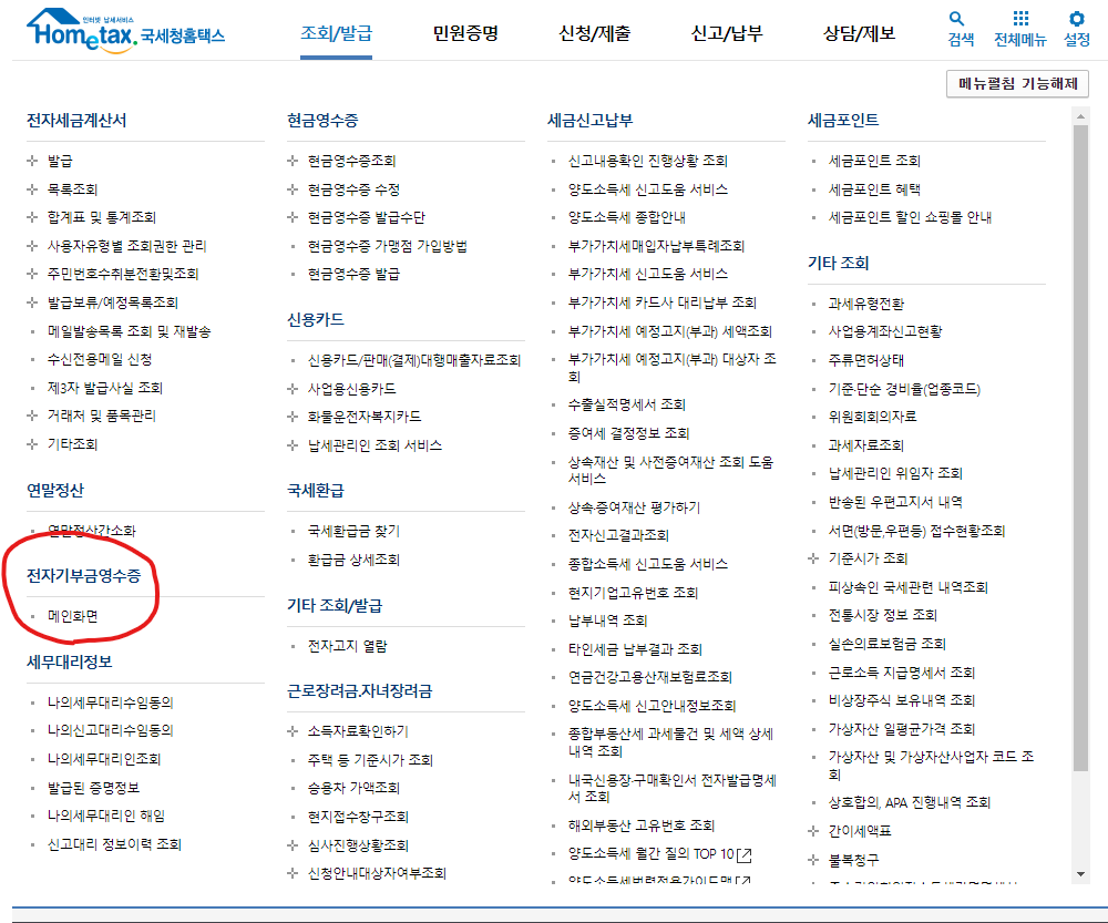 조회/발급 메뉴의 전자기부금영수증 - 메인화면을 클릭합니다.